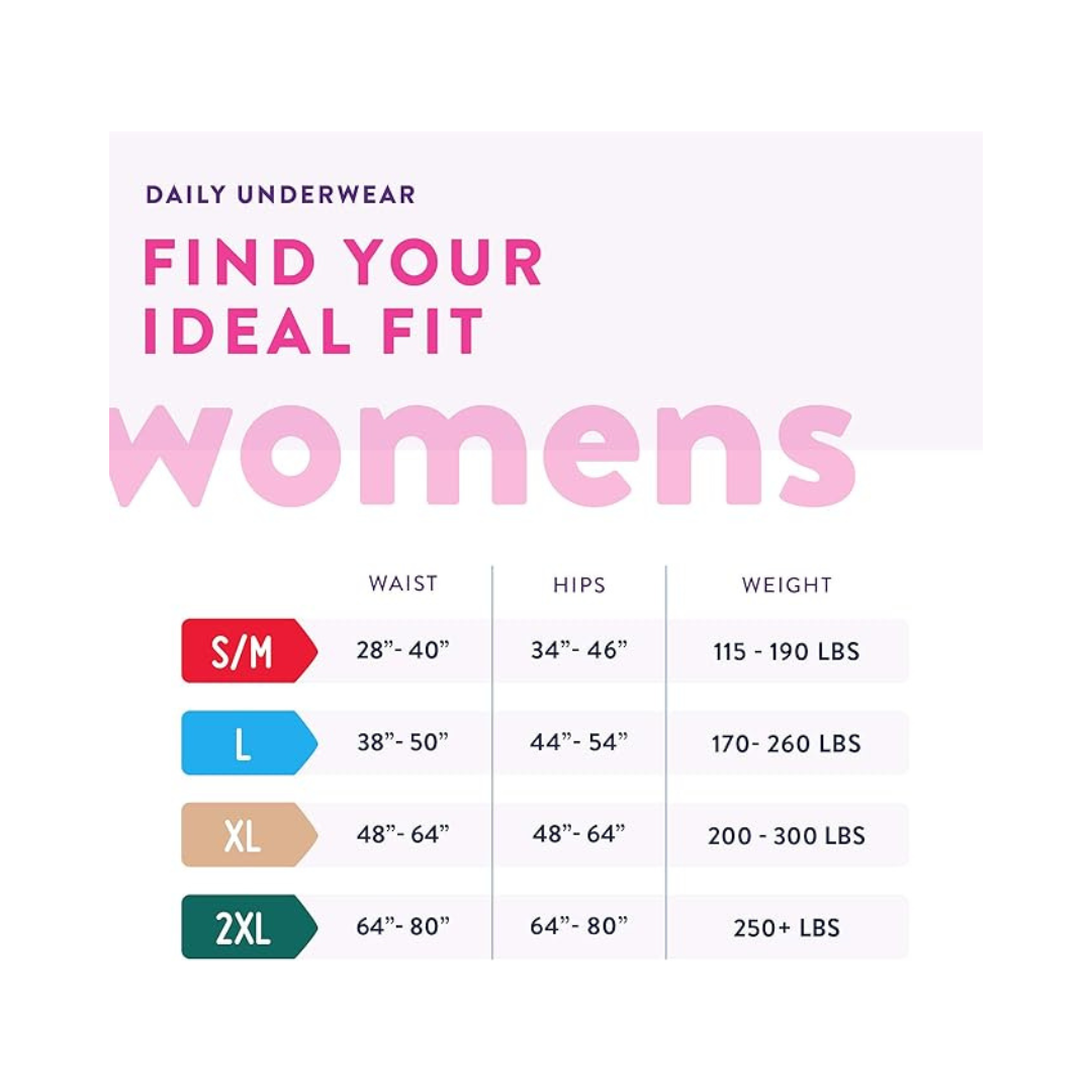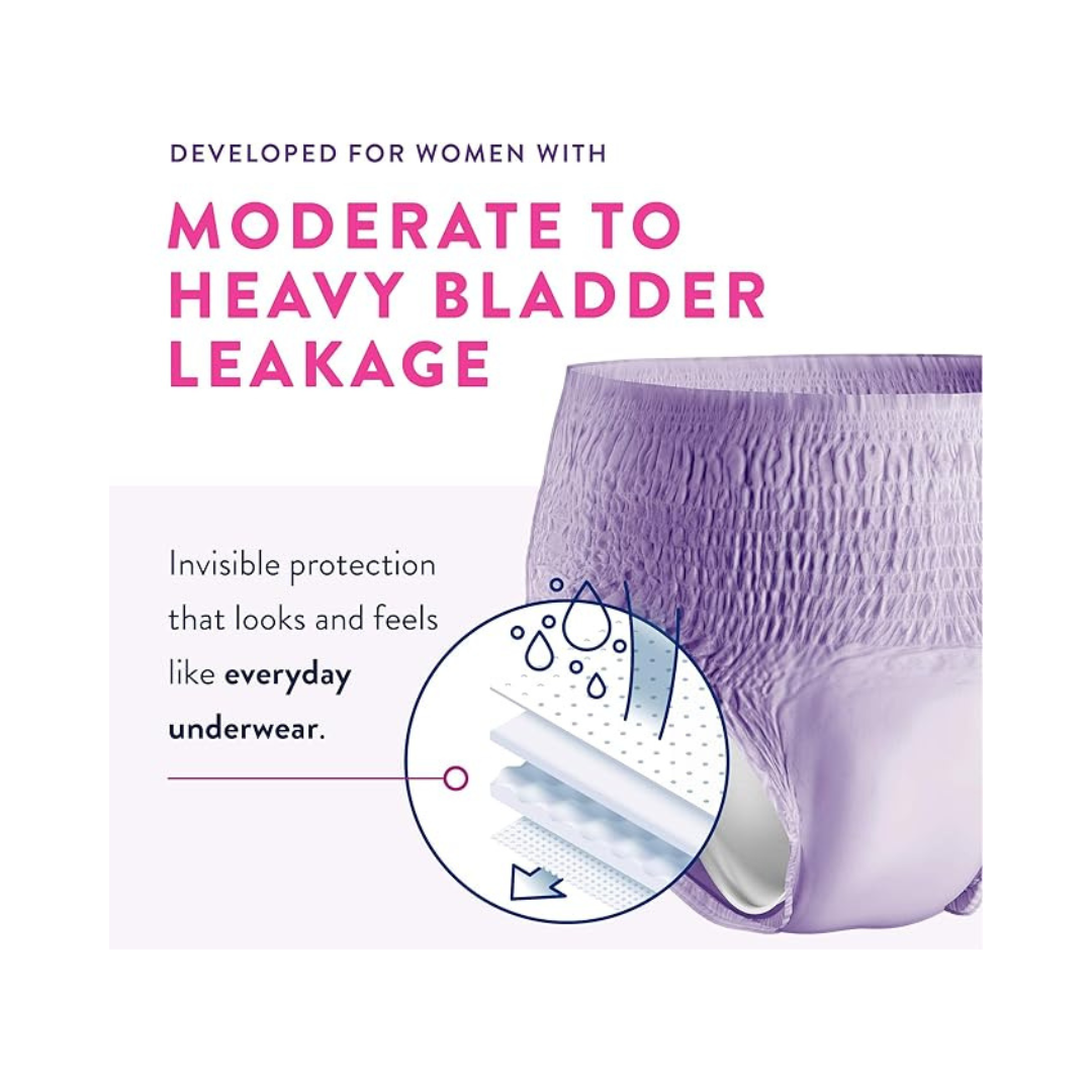 Take on every day with confidence in pretty lavender Prevail for Women: Maximum Absorbency Underwear. Specifically designed for women who need moderate to heavy leakage protection, it has the look and feel of regular underwear. Features include: 1) Dri-Fit cotton enhanced system to support healthy skin, 2) Comfort-Shape Plus with gentle elastics that shape to your body, 3) Breathable Zones that allow skin to breathe, 4) QUICK WICK with MaxSoft to rapidly absorb wetness, 5) Odor Guard to help prevent odors, 6) Cloth-Like Outer Fabric that is soft against the skin, and 7) Back Label with size like real underwear.